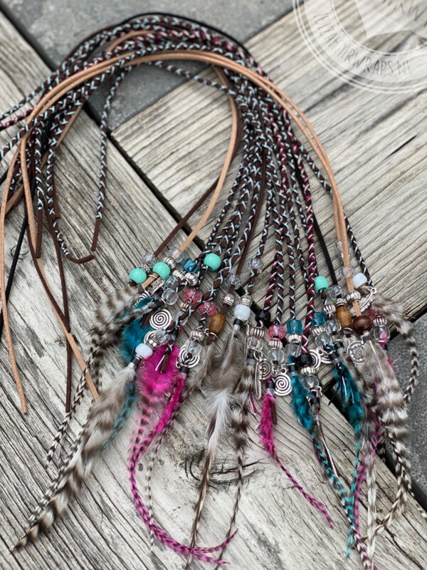 De Ibiza hairwraps zijn mooie, vrolijke hairwraps gemaakt van prachtig glanzend glitterdraad in verschillende vrolijke kleurtjes. De hairwraps zijn afgewerkt met verschillende kraaltjes, bedeltjes en super mooie veer.