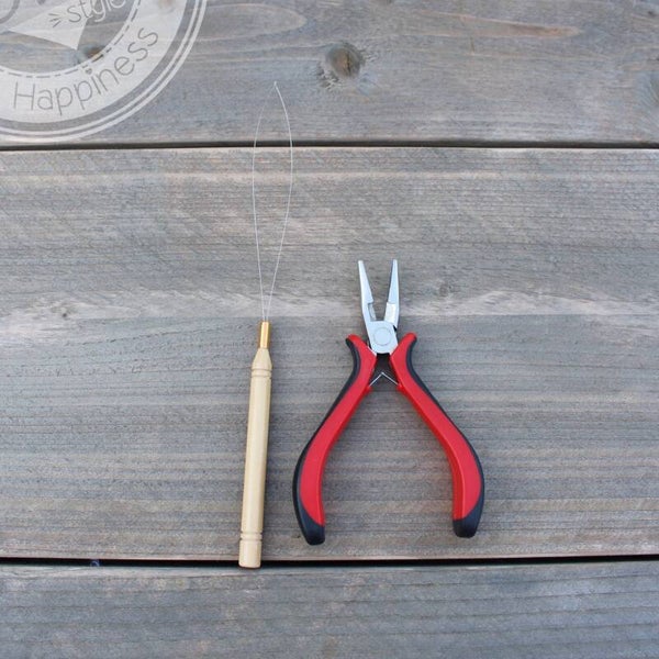 *Leg de hairwrap bovenop, of direct naast het plukje haar en knijp nu met een tang de microring, op 1 a 1,5 cm van de hoofdhuid, goed dicht.