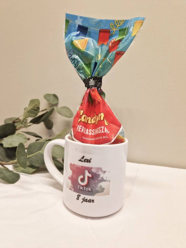 Verras je dierbaren met een uniek en persoonlijk cadeau: onze gepersonaliseerde mokken met of zonder een zakje snoep erin stel je zelf helemaal samen!